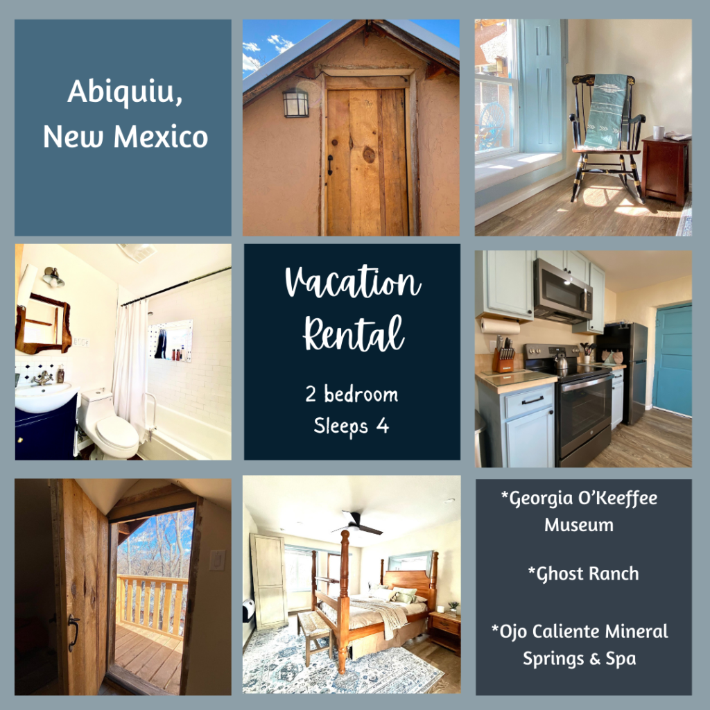 Discover serenity and artistic inspiration in our quaint vacation rental nestled amidst the majestic mountains of Abiquiu, New Mexico. Immerse yourself in the stunning beauty of Georgia O’Keeffe country, where every moment is a canvas waiting to be explored. With cozy accommodations, breathtaking views, and a peaceful ambiance, our retreat offers the perfect escape for nature lovers, art enthusiasts, and anyone seeking a tranquil getaway in the heart of the Southwest.